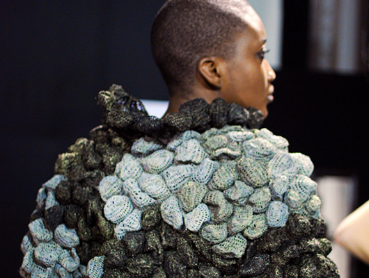 Quand il crée son vêtement, c’est la soie qui devient doublure et la matière végétale brute devient alors un bijou précieux, c’est de là que réside le challenge, rendre fluide ce qui ne l’est pas à la base.