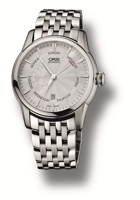 En plus de la fonction d’indication du jour par aiguille sautante évoluant dans le sens antihoraire, véritable signature d’Oris, la montre présente également une petite seconde à 9 h et une fenêtre pour la date à 6 h.