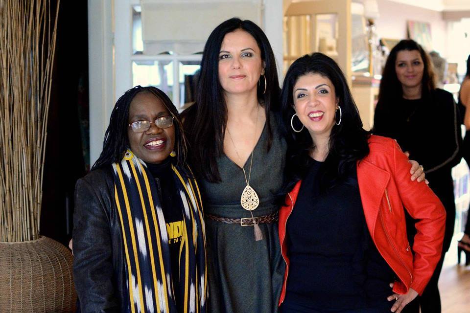 backstage UFFP à la Fairpride, à g Louise Faye modèle, Ouarda Helli designer et Fériel Berraies Guigny Pdte UFFP habillée par Ouarda H photo Damien Paillard