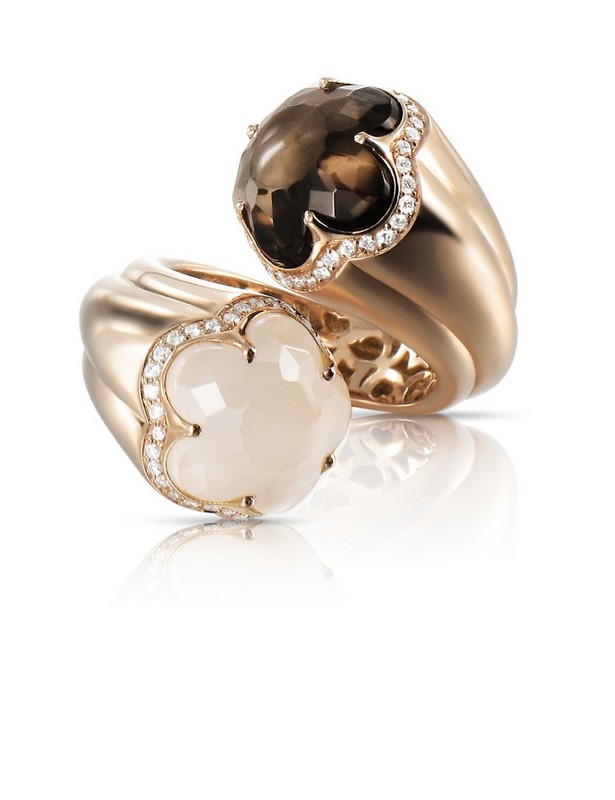 Collection BON TON BONHEUR – Bague “Toi et Moi” en or rose, diamants, quartz fumé et milky quartz – Jonc en or rose, diamants, quartz fumé et milky quartz.