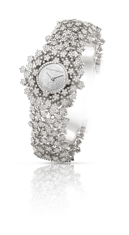 Chaque Rendez vous avec les GALERIES LAFAYETTE, est l’occasion pour PASQUALE BRUNI de présenter une pièce unique fruit du savoir faire de ses ateliers de Valenza. Après la Haute Joaillerie et ses bagues en tanzanite bleue, la Maison présentera en exclusivité sa première collection de montres joaillères en édition limitée et numérotée : FLOWER TIME. Une montre joaillère, entièrement articulée en or blanc et pavée de diamants blancs, faisant écho à la collection de bijoux PRATO FIORITO. Réalisé à la main, ce joyau des maitres artisans de la Maison sera édité en 46 exemplaires en hommage aux – déjà – 46 années de carrière du fondateur Pasquale Bruni.
