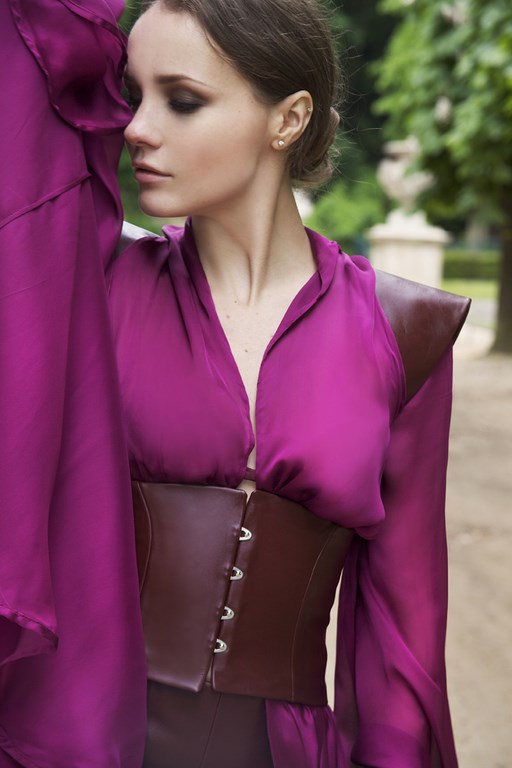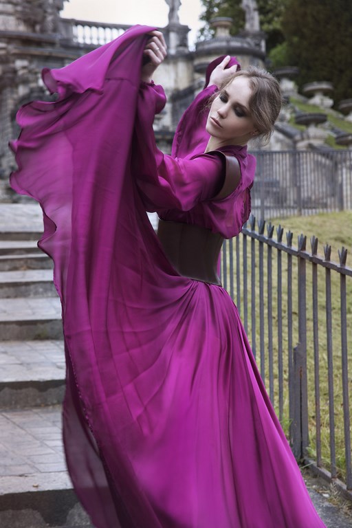 La ligne de la collection est fluide, aérienne composée essentiellement de mousselines, de soies, de crêpes Georgette, les matières sont naturelles et invitent à la douceur.