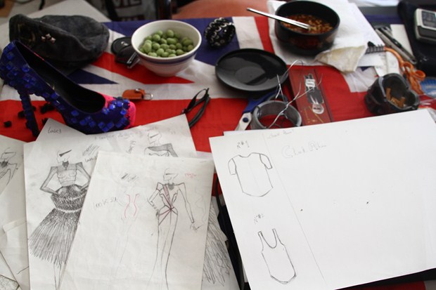 Walking into Seyf Dean Laouiti’s accessories atelier in Tunis, I feel a bit like Alice falling down the rabbit’s hole. Shoes, jewelry, books, and various knick-knacks are stacked on shelves, tables and a sewing stand. Spilling out of a bag are pieces from Laouiti’’s new collection, fresh from a recent photo-shoot for his magazine, FFDesigner. A box of rosettes sits on one desk, a skull ash tray on another, and a lip-shaped telephone on a shelf. It’s like a grown-up playroom, and Laouiti (with his spike-adorned top-hat) is the Mad Hatter and creator-in-chief.