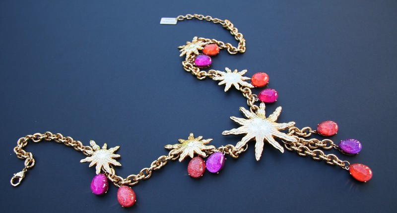 La ligne Soleil de nuit se compose de 3 parures composées d’un sautoir, un collier ras du cou, un bracelet, des boucles d’oreilles avec perles pendantes, des boucles d’oreilles Soleil et une bague, tous déclinés dans les teintes fuchsia et orange, vert et bleu ainsi que bleu et gris.