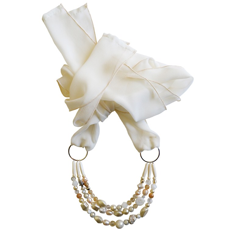 Fossil : plastron et boucles d’oreilles chics dans des tonalités et matières naturelles (terre cuite, tissu, coquillage) associés à des touches de tissus aux d’imprimés animaliers pour un métissage ethnique raffiné.