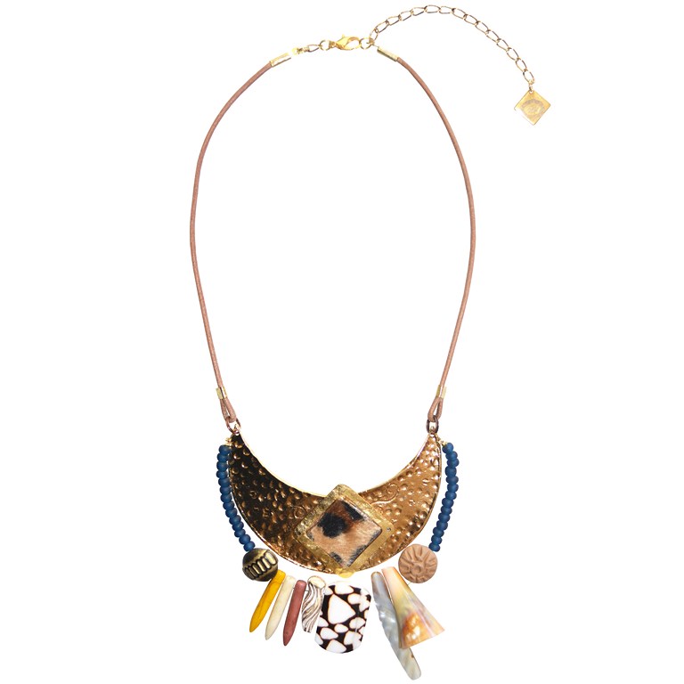 Fossil : plastron et boucles d’oreilles chics dans des tonalités et matières naturelles (terre cuite, tissu, coquillage) associés à des touches de tissus aux d’imprimés animaliers pour un métissage ethnique raffiné.
