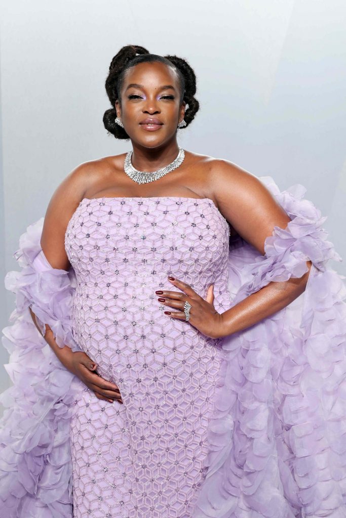 | Wunmi Mosaku attended the Vanity Fair Oscar Party wearing a custom Georges Chakra Couture gown from the Spring/Summer 2026 collection. A lilac amethyst strapless column gown embroidered in a tonal geometric sequin lattice. Cascading layers of petal cut organza form a voluminous sculpted capelet, extending into a dramatic train. |