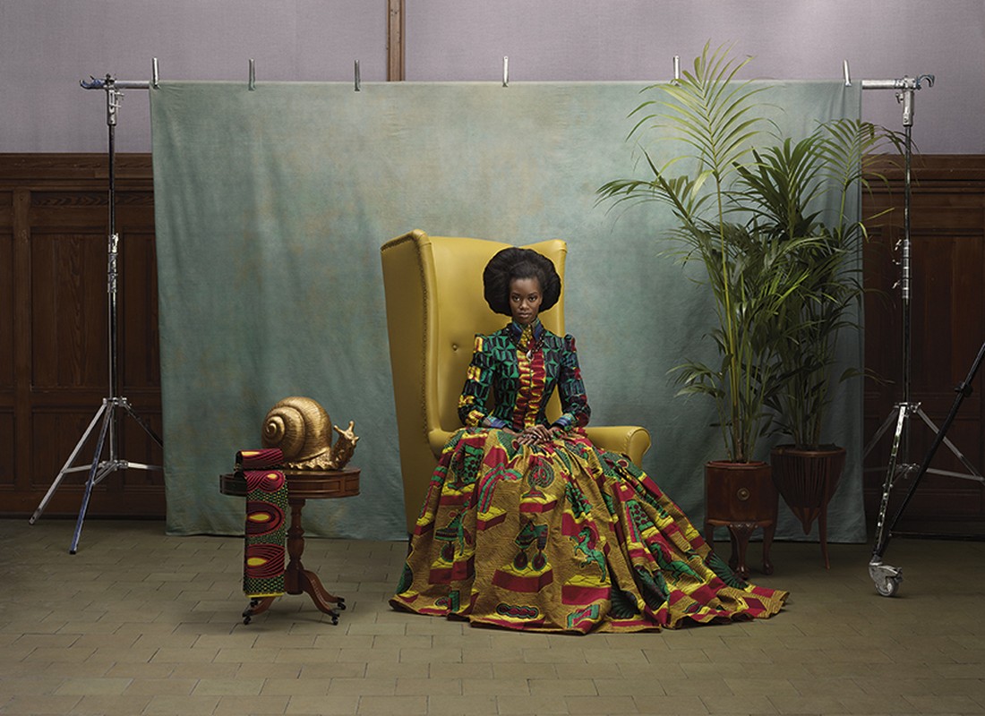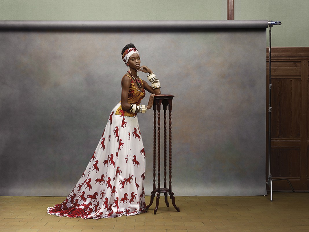 To give their stories a podium, various heritage designs were reinterpreted for the collection. This idea inspired our designers to create a new fabric design, which has become the signature look of the collection – an amalgam of famous Vlisco figures literally placed on a pedestal. We took the idea a step further in our communications campaign by placing our fabrics and models on a pedestal in beautifully set-up surroundings. We used gold symbols to represent the designs and chose a style of photography often used in royal portraiture. To capture the essence of Hommage à l’Art in the campaign, Vlisco collaborated with Maarten Spruyt, a renowned art- and fashion stylist and photographer Koen Hauser, who is known for his timeless style.