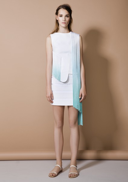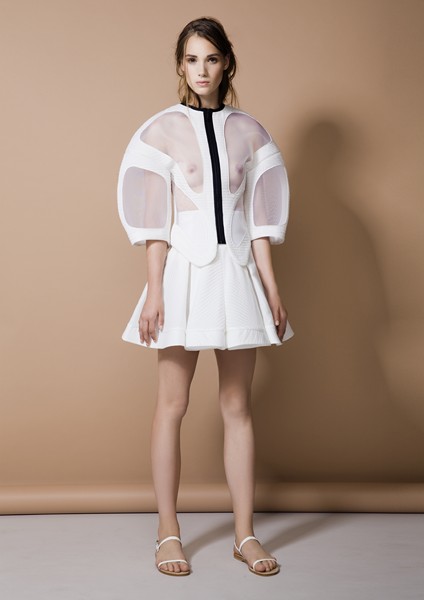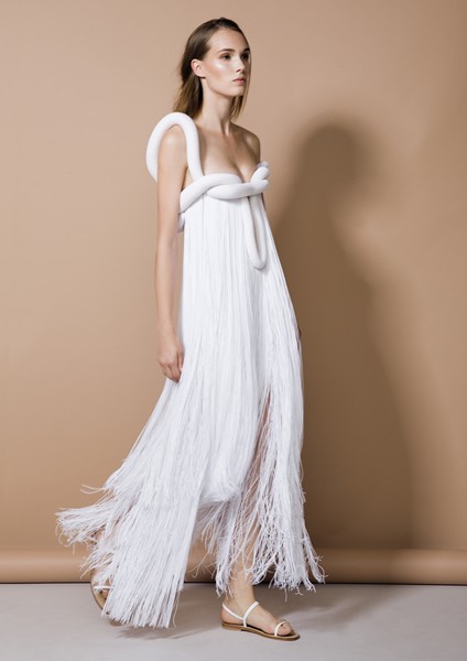 White informs Sylvio Giardina’s Spring/Summer 2015 collection. White Noise embraces all audible frequencies, therefore all colors. The new project shapes white by using different textures, brightening up and creasing on dresses rendered in luminescent satins and 3D brocades. White is absolute, enriched by pictorial injections simulating unexpected shadows and underlining the outfit structure. Other colors – acid green and aqua green – design embellishments following the asymmetrically cut flounces and developing on different lengths, creating a new way to interpret white: they emphasize it, melting and vanishing in the hems of dresses or skirts, giving life to a perpetual movement.