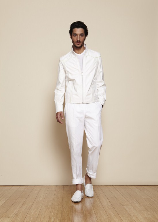 La piqûre ZILLI se triple pour multiplier les points de lumière sur un classique de la maison (poignet frisette et col chemise) tandis que deux équerres de cuir viennent souligner la force d’une coupe motard.