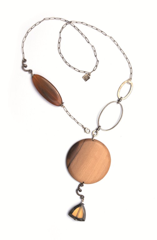 Sautoir Bois, expressif et graphique, résine, cristal et argent antique.