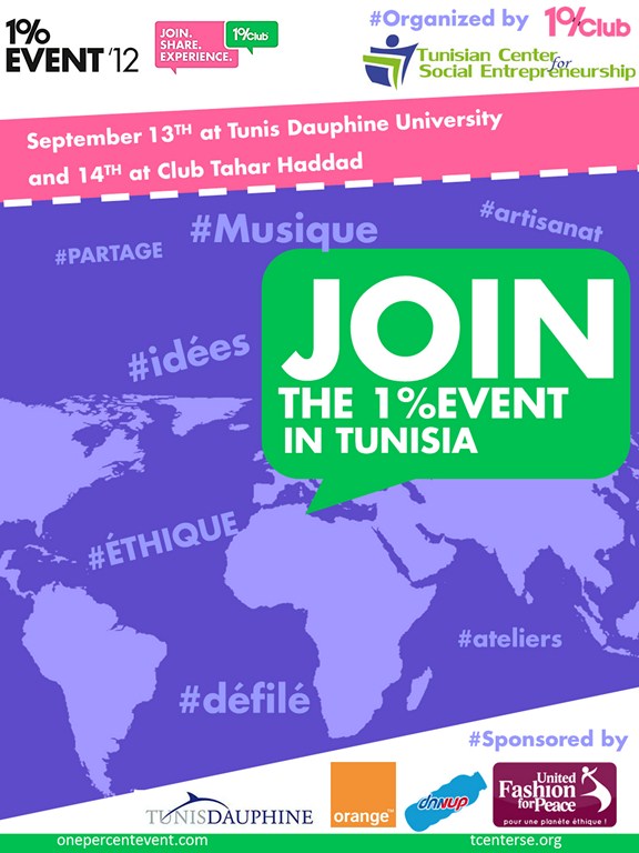 Les 13 et 14 Septembre 2012, deux dates pour  un évènement de sensibilisation aux comportements responsables incitant à l’engagement en faveur d’entrepreneurs sociaux : 1%EVENT  – TUNISIA !
