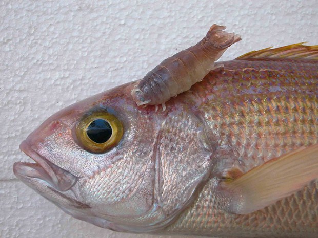 Les parasites sont généralement petits et invisibles à l’œil nu. Exception ici, ce gros isopode parasite (Anilocra gigantea) photographié vivant sur le poisson Pristipomoides filamentosus). Le parasite est maintenant dans les collections du Muséum national d’Histoire naturelle. © Jean-Lou Justine / Muséum national d’Histoire naturelle