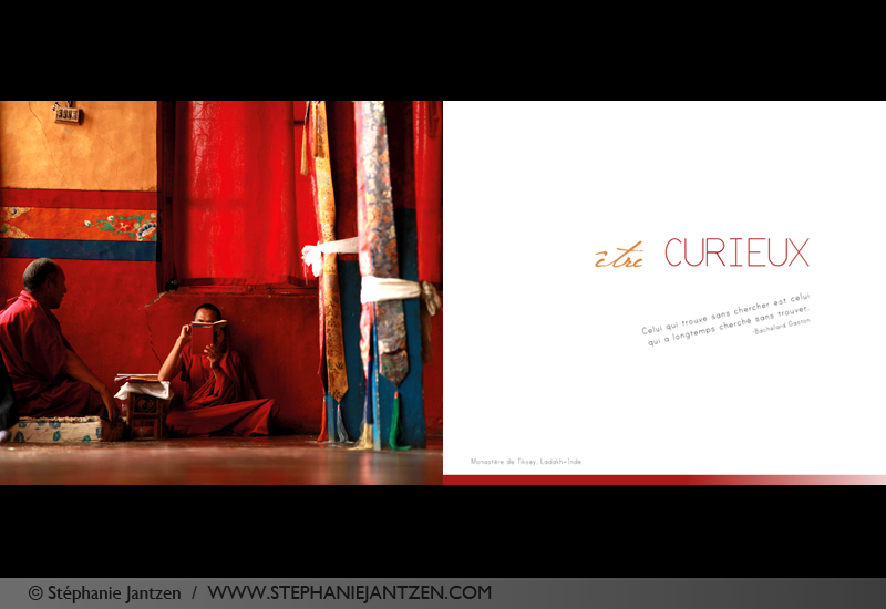 « L’Inde, pays de contrastes, nous confronte au pire comme au meilleur, et ce dans le même instant. L’Inde est aussi et surtout un pays d’une infinie richesse, spirituelle et culturelle. Il est aussi vrai que ce pays change à vue d’œil, comme beaucoup d’autres lieux, les valeurs et les modes de vie se transforment et se mondialisent. Dans un monde bombardé par les médias, décrivant essentiellement les côtés négatifs des lieux et des événements, j’ai décidé de part ce livre de partager uniquement l’autre versant de la réalité du monde ; le beau, le pur, en couleur ! Et c’est dans ces contrastes du quotidien Indien que j’ai donc voulu focaliser mon attention uniquement sur les valeurs pures et les qualités intrinsèques des gens et du pays. Durant ces périples, J’ai fait des rencontres inoubliables, des regards qui m’ont touché par une gentillesse sincère et une générosité du cœur authentique. J’ai vécu des moments de joie, et malgré les apparences qui pour les occidentaux pourraient sembler terribles, avec le cœur léger, les enfants jouent. Des moments d’esthétisme magiques! Des couleurs qui ouvrent « en grand » le regard d’une photographe. Des paysages d’Himalaya grandioses, qui semblent encore être intouchés par la pollution. »