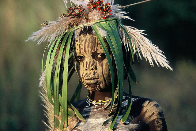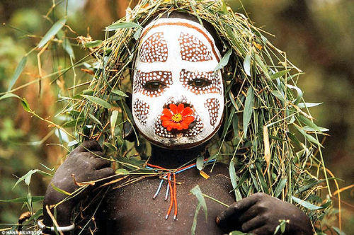 Car autrefois, la peinture était présente chez tous les peuples de la région, aujourd’hui elle conserve son importance et sa pureté millénaires dans les tribus qui n’ont que très peu ou pas du tout de contact avec le reste de la civilisation. Chez les Hamers, les peintures corporelles étaient extraordinaires, des photos d’il y a 30 ou 40 ans en témoignent. Mais c’est le tourisme, qui en a détruit l’authenticité et la spontanéité. Hans Sylvester, a pour sa part, jeté son dévolu sur une peuplade particulière, la tribu des Surmas. Très isolés dans un territoire qui passe la frontière entre l’Éthiopie et le Soudan ; l’accès y est compliqué, car ce peuple par la force des choses est aussi un peuple de guerriers. S’aventurer dans cette région est donc une gageure que le photographe allemand a parfaitement contourné. Les habitants comme les Surmas n’ont pour la plupart, aucune connaissance de l’extérieur. Petite anecdote à partager : quand Hans Sylvester y est allé la première fois, le seul objet qu’ils possédaient en provenance de notre civilisation était la Kalachnikov…