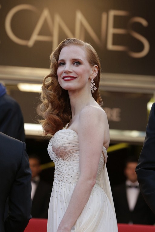 Jessica Chastain, the American actress was wearing a platinum ring set with one emerald cut diamond and diamonds and a pair of 18ct white and rose gold earrings set with diamonds