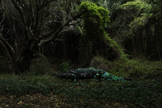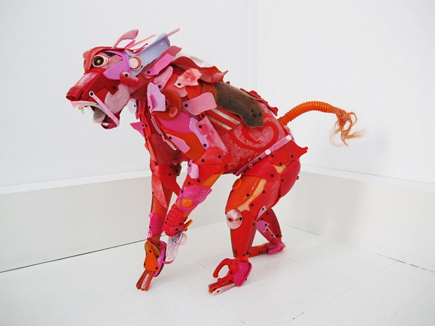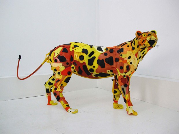 Ainsi, il récupère sur les plages les produits dérivés du pétrole et de son industrie que rejette la mer, avec lesquels il crée et façonne les animaux emblématiques en voie de disparition. L’ours, le loup, la panthère, le crocodile, le singe en écailles colorées … se