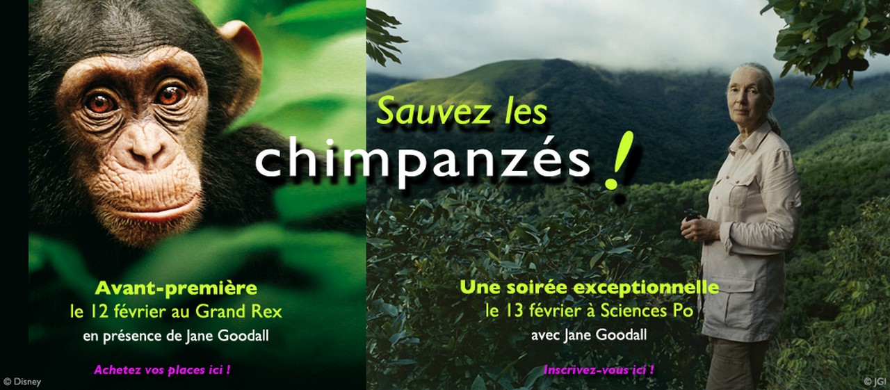 Encore une fois, UFFP  rappelle que l’homme est autant la source des maux mais également la solution aux maux de notre planète. Vous pourrez, rencontrez Jane Goodall, à Paris à Sciences Po lors d’une conférence inédite, à l’ occasion du lancement de son dernier livre, paru sur Actes Sud. Vous pourrez également, voir son dernier film documentaire le 12 février au Grand Rex, en présence de Jane Goodall.