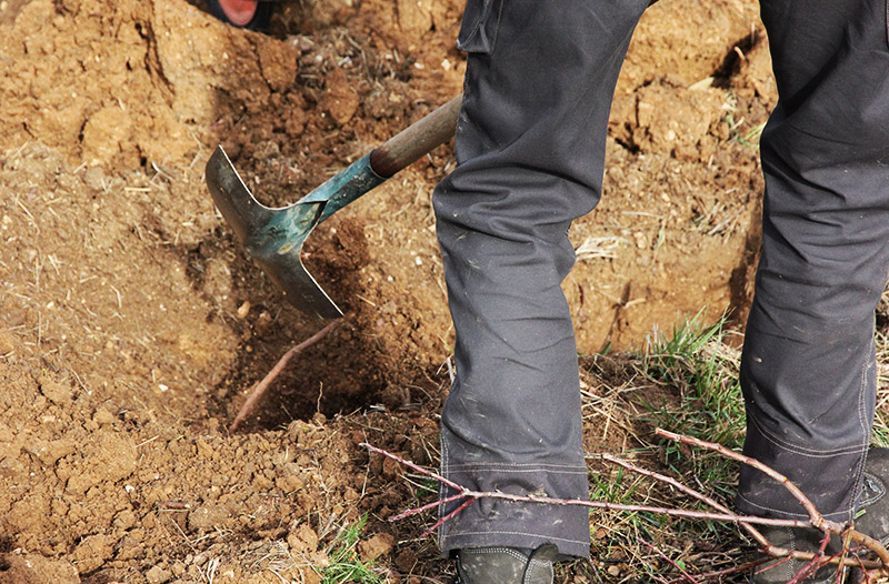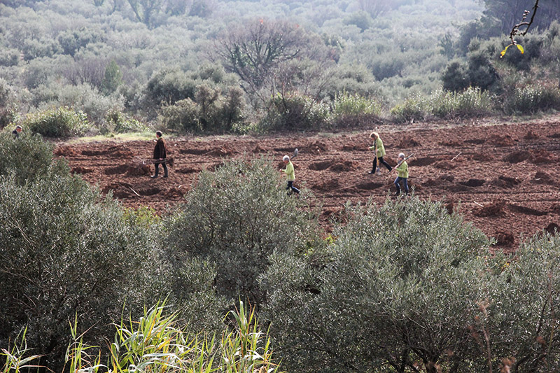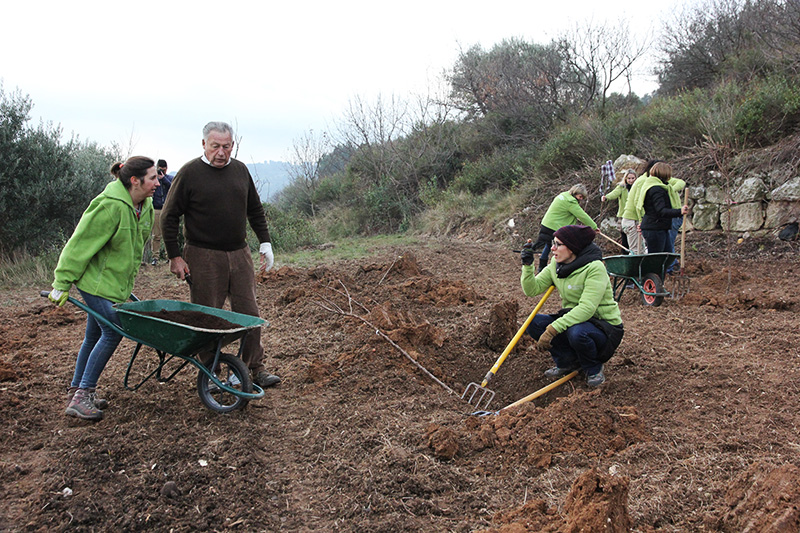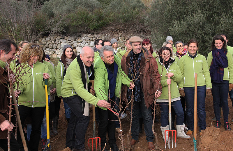 Sous l’imposant château et sur le flanc de la colline, l’équipe de la Fondation et les locaux se retrouvent armés de pelles et de bêches pour mettre en terre les jeunes amandiers d’Ardèche.