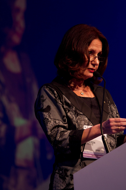 Maria das Graças Foster, the first woman ever to preside over the massive Brazilian energy corporation Petrobras, gave a firm and emotional speech that included endearing stories of her experience as a woman working in a male-dominated company. “My challenge was not to accept any limits, and not to give up. My message to you is: do not accept limits when you are in search of equality between human beings,” she said.