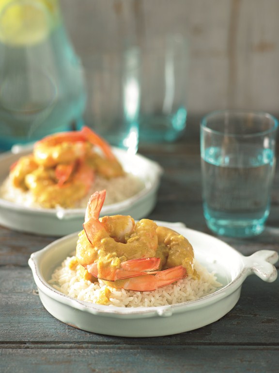 2 Incorporez les crevettes. Couvrez et poursuivez la cuisson 5 min environ : les crevettes doivent être cuites à cœur. Ajoutez le jus de citron, rectifiez l’assaisonnement en sel et en curry, puis servez, sur le riz.