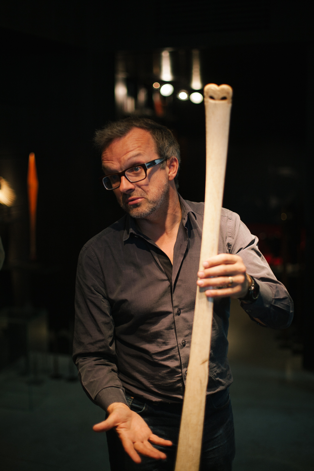 Patrick& Ondine Mestdagh présentant une arme d'Océanie www.patrickmestdagh.be