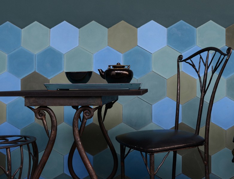 Puis Agnès Emery découvre l’ancestral travail du point noué au Népal où un atelier traditionnel réalise ses tapis de laine et de soie exclusivement d’après ses dessins et ses couleurs. En 2008, ses pas la mènent au Vietnam où elle développe toute une collection de carrelages en céramique semi-porcelaine figurant ses chrysanthèmes ou dragons en relief et traces de paysages peintes en bleu, motifs asiatiques qu’elle réinterprète plus qu’elle ne les copie. Quant au velours, au lin et à sa peinture artisanale, ils sont manufacturés pour elle en Belgique.
