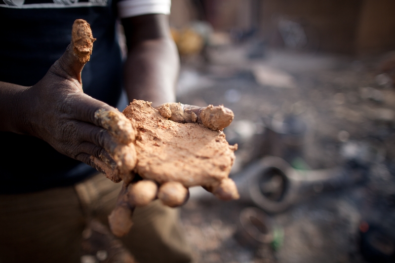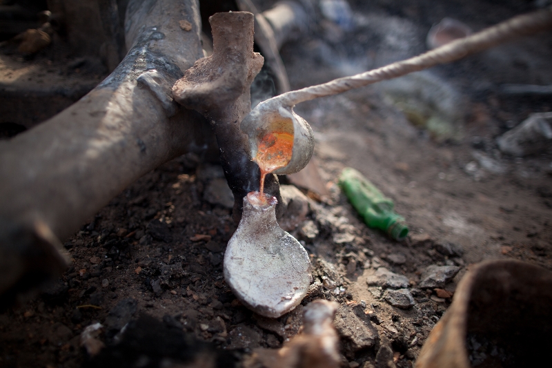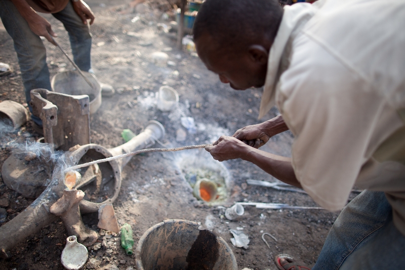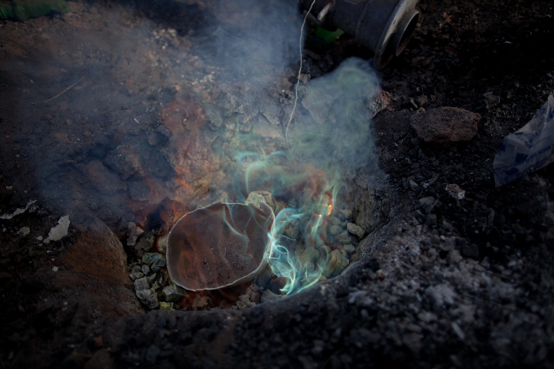 Un moteur de congélateur contenant des pièces de métal est déposé sur un deuxième foyer boosté par un soufflet manuel pour élever la température. Ce sont des robinets, vieux cadenas et autres matériaux de récupération qui, une fois fondus, seront déversés dans les moules en terre.
