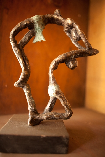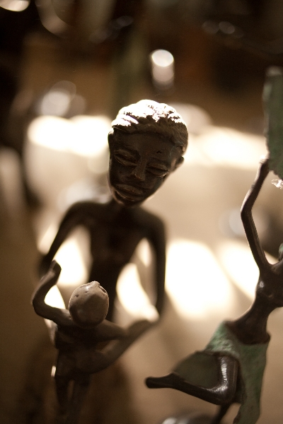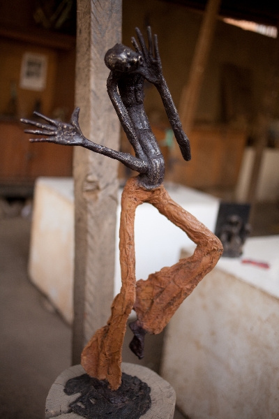 Assis sur des souches de bois, les artisans liment, poncent et découpent les nouvelles pièces de bronze. Sur les étagères, au sol, une multitude de sculptures de tailles différentes sont exposées dans un grand désordre esthétique. Ici, le métal patiné et poli décrit poétiquement le corps dansant. Yacouba Touré, l’auteur, travaille sur la thématique de la danse et l’expression des corps. Ses figures élancées posent dans un mouvement figé. Ses créations sont inspirées des différentes compagnies qu’il fréquente, celles d’Iréne Tassembedo et Seydou Salia à Ouaga, ou de Ketly Noël à Bamako… Yacouba partage son stand avec Adama Ilboudo qui présente d’autres pièces d’inspiration végétale.