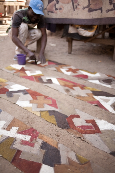 Les dessins choisis sont en effet lisibles comme la marque d’identité d’une population, d’un village, mais aussi d’un artiste en particulier. Outre son utilisation en tant que textile dans la fabrication des tuniques masculines et des pagnes noués des femmes, des vertus thérapeutiques et cicatrisantes lui étaient aussi attribuées. Sur de grandes tables ou étalés sur le sol, Bado compose des figures. Attentif, il applique à l’aide d’un pinceau la terre fermentée sur les bandes de coton qui, après rinçage et séchage, seront cousues entre elles.