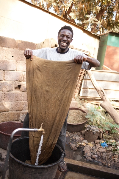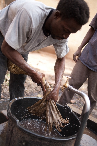 Au-dessus des bassines, Bado rince à grandes eaux de longues pièces de tissu. Aidé par un autre artisan, ils étirent à quatre mains les pièces une à une pour les suspendre au soleil.