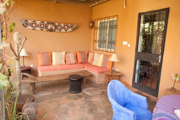 Quant aux diners, ils se commandent à l’avance au restaurant Paradisio non loin de la maison. Dans les grands salons, l’ambiance est ici typiquement touareg. L’art contemporain est largement représenté par les œuvres du burkinabé Sambo Boly mais aussi par celles d’autres artistes comme les étranges oiseaux sénégalais du poète Tall Diedhiou. Spacieuses, les 7 chambres proposent un décor raffiné.