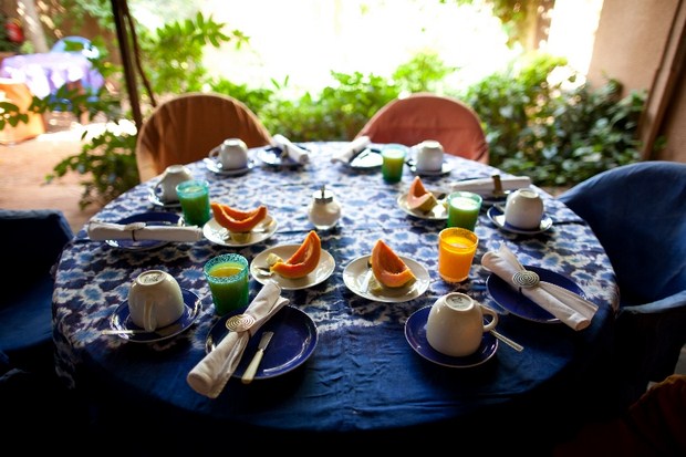 Les terrasses sont simplement aménagées et réservées à l’espace déjeuner ou diner. Les tables sont dressées sur des nappes colorées. Pain ou confitures, jus de fruits maison, le moment est délicieux.