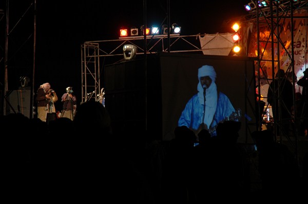 Comme chaque soir, sur cette tribune commune, les groupes se forment spontanément autour des feux de camp. Simplicité de la rencontre… Devant eux, une grande scène ouverte, dont la capacité sonore défie par sa puissance le silence désertique. Mais la lumière des projecteurs éclaire le désert sans concurrencer les étoiles…