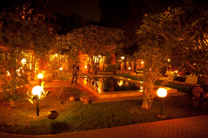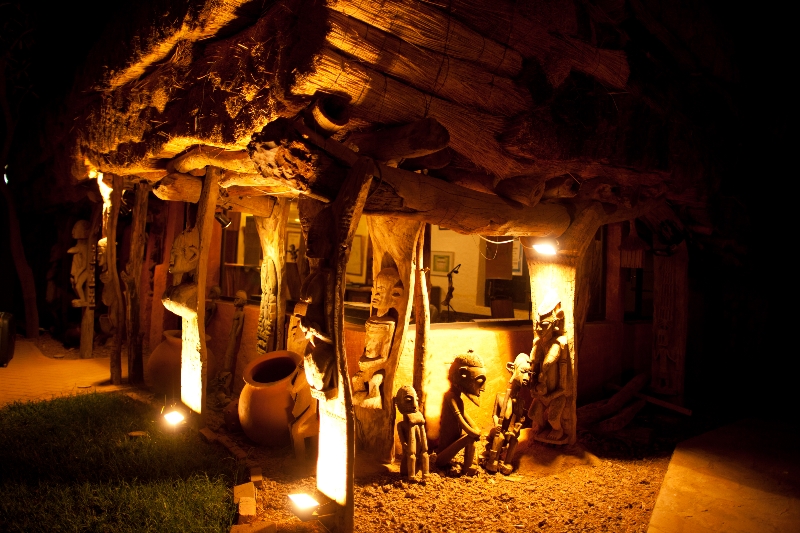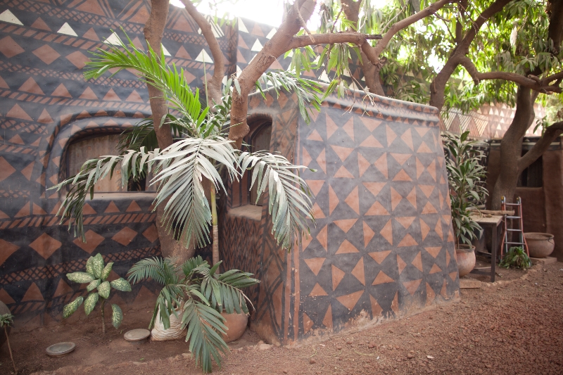 Derrière le grand portail, Princess’Yenenga Lodge est au cœur de Ouagadougou un oasis de fraicheur. Le jardin joliment arboré et fleuri fait le trait d’union entre différentes terrasses et architectures empruntées aux constructions traditionnelles africaines. Maison des palabres malienne, murs peints de motifs géométriques de la région de Tiebele, le lieu est conçu par la propriétaire Martine Clément avec les artisans locaux.