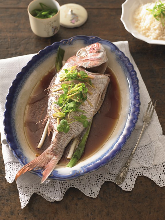 1 Rincez la daurade, puis épongez-la soigneusement dans du papier absorbant. Ménagez 3 entailles profondes sur chaque flanc avec la pointe d’un couteau, dans la diagonale. Disposez la ciboule-ail dans un plat supportant la chaleur suffisamment grand pour contenir la daurade, puis déposez cette dernière sur les herbes. Mélangez le bouillon et la sauce soja dans un bol. Versez-les sur le poisson, parsemez ce dernier du gingembre.