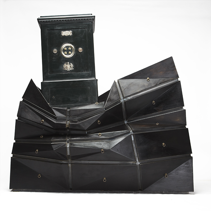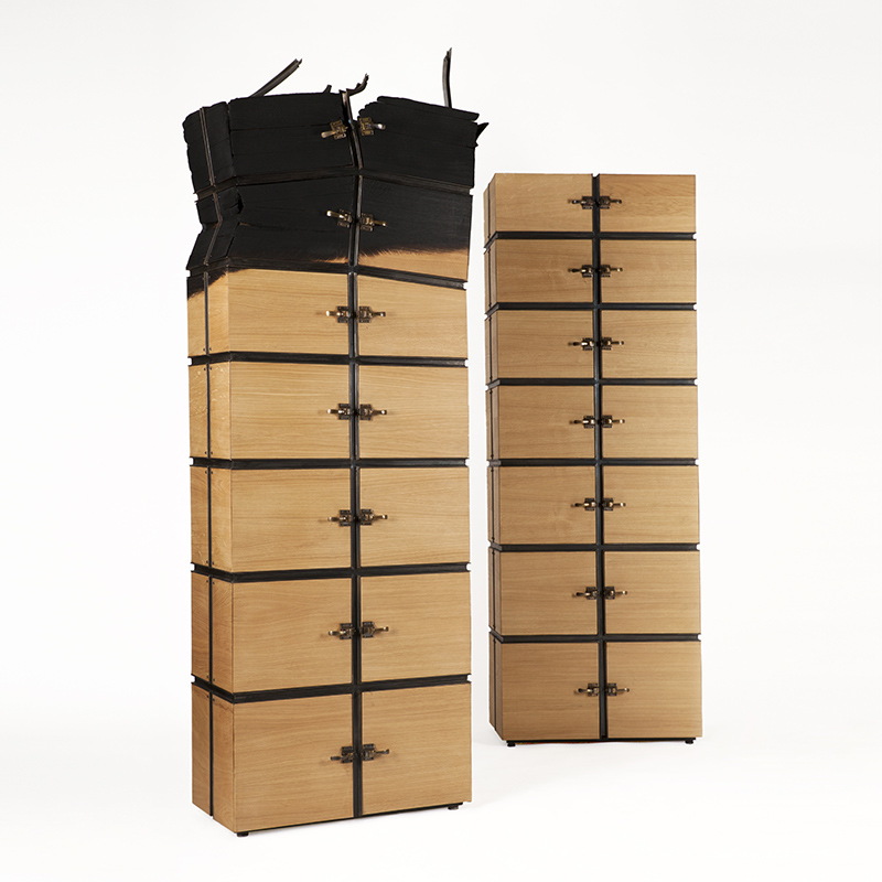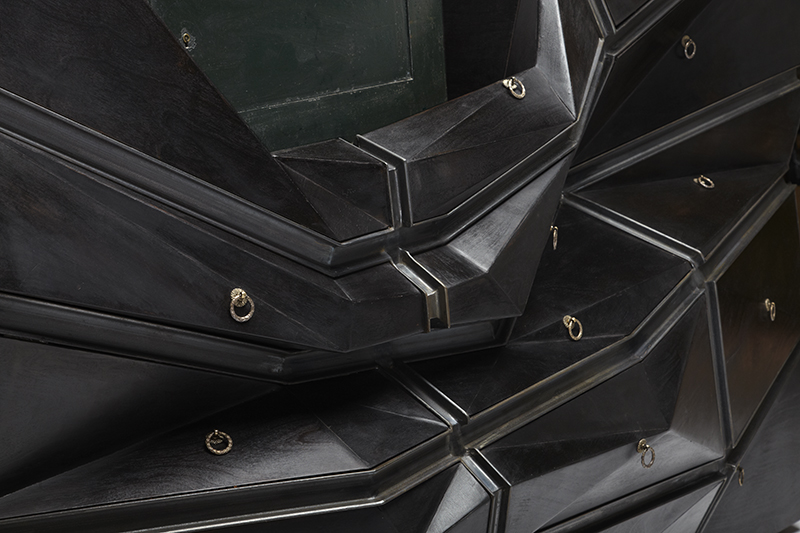 Meuble d’apothicaire en acier et bois brûlé, « Coiffeuse CC » en laiton et bois brûlé, meubles à casiers « Les Foudroyés » en acier et chêne massif, secrétaire « Métempsychose » en inox et bois d’établi, table « Rosanna T1 » en laiton et jade, et l’étonnant meuble sculpture « AAA » composé d’un coffre-fort Empire écrasant une console en acier et bois brûlé…