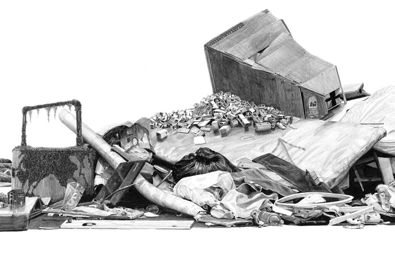 The Cut, 2011, crayon sur papier, 29,7 x 504 cm : The Cut fait référence à l’histoire du canal de la rivière Léa dans l’Est de Londres, appelé Hackney Cut. Dans son dessin méticuleusement détaillé, Jessie Brennan interprète les informations recueillies sur le lieu. Nourrie par des témoignages de personnes vivant ou travaillant le long du canal, son œuvre s’inspire également des bouleversements urbanistiques de ce quartier, liés à la préparation des jeux olympiques de 2012.Autre œuvre ; Medway, 2013, graphite sur papier (triptyque), 145 x 360 cm.