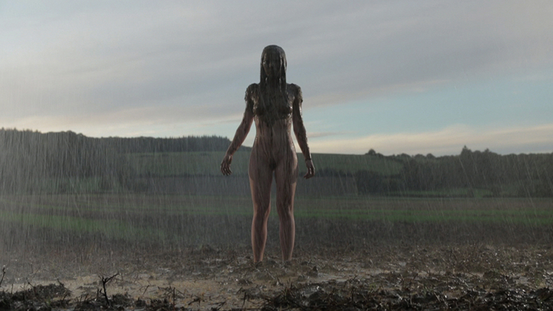 Les Ruisselantes, 2012, vidéo HD, 16’47 min : Cette vidéo met en scène un corps féminin convulsant dans un champ sous un rideau de pluie glacée. Ce n’est qu’en s’approchant de l’écran que le spectateur s’aperçoit de la souffrance du corps exposée à cette épreuve physique. Il devient témoin, voyeur et otage d’un tableau vivant d’une étrange brutalité. S’articulant autour du rêve, du sacré et de sa profanation, les sculptures et vidéos de Nour Awad offrent un répertoire de formes et d’images sensuelles et étranges, détournant des mythes, des fragments de lieu de culte ou de mémoire dans lesquelles répulsion et toucher, l’inversion des genres féminin-masculin et la mise à l’épreuve du corps deviennent des enjeux. Autres œuvres ; Glory Hole II, 2012, plâtre polyester, peinture acrylique, bois, 90 x 90 cm ; La Suspendue, 2012, faïence, acier, 80 x 45 x 45 cm.