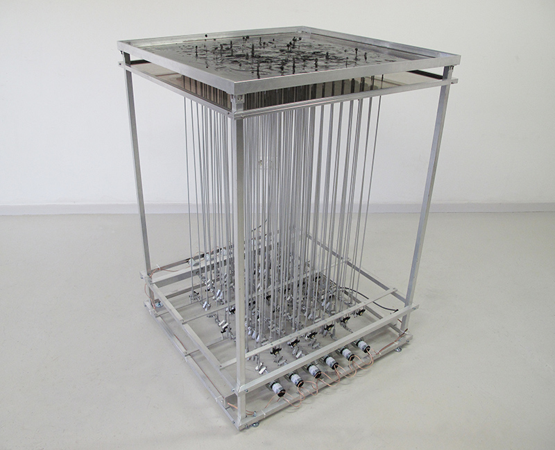 Dark Rain, 2012, aluminium, moteurs, bacs en silicone, eau, 118 x 36 x 86 cm : ValèreCostes renverse le processus et créer un dispositif artificiel pour recréer les effets de la nature. Ses installations seraient des simulacres de simulations, comme Dark Rain, qui produit l’effet d’une mousson miniaturisée avec son et lumière, produite par 144 tiges verticales dans un bac sombre. Cependant, nulle pluie ne tombe du ciel, l’artiste inversant ici la spatialité habituelle. Du parallélisme rigoureux de leurs trajectoires (sorte de figuration graphique de la pluie) résulte pourtant l’apparition aléatoire des gouttes. Cette pluie est déclenchée à l’approche du spectateur curieux venu chercher son reflet dans l’eau sombre.Autres œuvres ; Karstic story, 2007, plâtre, eau, sable, entonnoirs, moteurs, tubes, dimensions variable2007 et The Build, 2012, vidéo, 23 mini-vidéo.