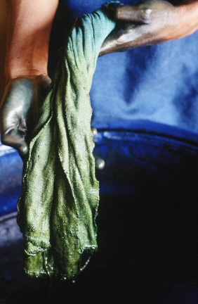 Depuis des siècles, de l’Asie à l’Amérique, le bleu est obtenu à partir de plantes à indigotine. Sur huit cents espèces répertoriées dans le monde, plus de six cents se trouvent sur le continent africain. Culture devenue rare, l’indigofera arrecta que récolte Aboubakar, est un arbuste poussant dans la zone sahélienne. D’une excellente qualité tinctoriale, il ne suffit cependant pas à la production de l’atelier. Il faudra faire des milliers de kilomètre et partir en Guinée pour collecter le lonchocarpus cyanescens sauvage. Les jeunes feuilles sont recueillies, pilées, mises en boule puis séchées. Ces boules de compost sont conservées jusqu’à l’emploi. Avant l’invention de l’indigo de synthèse au XIXe siècle, les plantes indigofères étaient les seules sources de bleu avec le pastel qu’elles détrônèrent pour leur meilleur rendement. Émerveillé par la magnificence des nuances de bleus générées par cette plante verte.