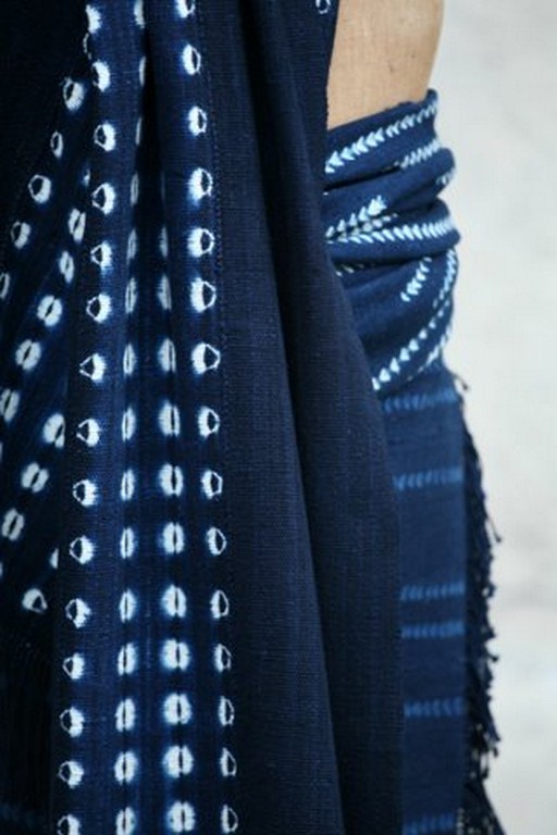 Aboubakar utilise différents matériaux textiles comme support de création. En camaïeux, les fils de coton bleutés se tissent en rayures avec les écrus pour les accessoires de la ligne Sawura créée par Aboubakar. Il teint et façonne le finimugu ou bande de cotonnade filé et tissé à la main, le lin, le chanvre, la soie, le pina (fibre d’ananas)… De par leur caractère écologique et la préciosité de leurs fibres, ces matières conviennent à la teinture naturelle, unie, en plusieurs nuances. Shibori ou tye and dye, le travail de réserves pratiqué sur toutes sortes de supports avant teinture, permet de réaliser des motifs uniques. Du voile aux textures plus lourdes, le textile prend les formes de couvre-lit, portière, coussin, moustiquaire…. de quoi habiller la maison toute entière.  Art de vivre qui se conjugue avec des vertus apaisantes, favorisant la rêverie, le bleu se porte aussi avec élégance en étole, chèche, ou chemise… Sa production conjugue les accessoires de mode et de décoration en pièces uniques et en série limitée.
