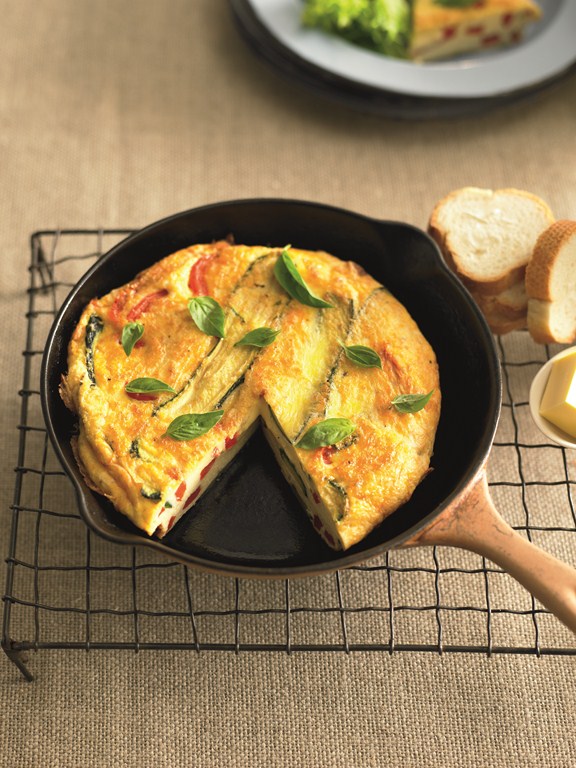 5 Retournez la frittata sur le plat de service. Décorez des feuilles de basilic juste avant de servir, chaud ou froid.