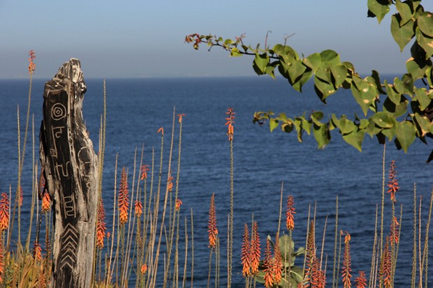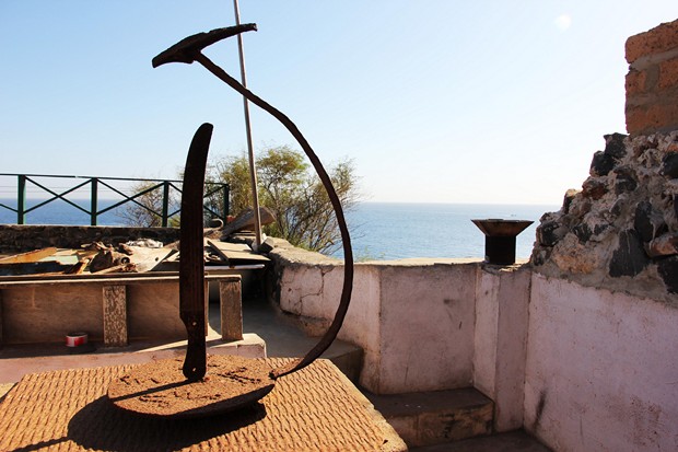 Nous sommes allées à la rencontre d’un grand artiste solitaire sur Gorée. Un robinson Crusoé d’un nouveau genre qui a choisi de vivre loin de tout, en bas de l’île dans un ancien bunker où du temps de la colonie se trouvait un canon qui stoppait tout intrus désireux de se rendre dans l’Ile forteresse. Arriver jusqu’à lui était une véritable expédition, terrain étroit et escarpé, vue plongeante sur l’océan. Expédition qui pourrait en décourager plus d’un. Mais la rencontre avec l’artiste atypique, Gabriel Kemzo Malou valait le détour. Il a choisi de vivre loin de la foule des humains, près de la nature sauvage, entouré d’objets artistiques hétéroclites, vestiges de ses parcours créatifs. Entouré de sa petite famille, et de ses petits garçons qui m’ont reçue à coup de bâton, « il faut bien qu’enfance se passe » l’interview a été vite écourtée pour coups et bastonnades !