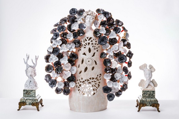 Céramiste sculpteur, Fabienne Auzolle modèle la douceur et la grâce. La femme, vierge ou jeune fille, est son sujet de prédilection. La terre blanche est laissée en biscuit, parfois rehaussée d’émail et de touches colorées. L’image est féminine et tendre. Elle se présente en buste ou en majesté, sous un petit bonnet ou auréolée de fleurs, agrémentée aussi de quelques accessoires élégants parfois étranges.