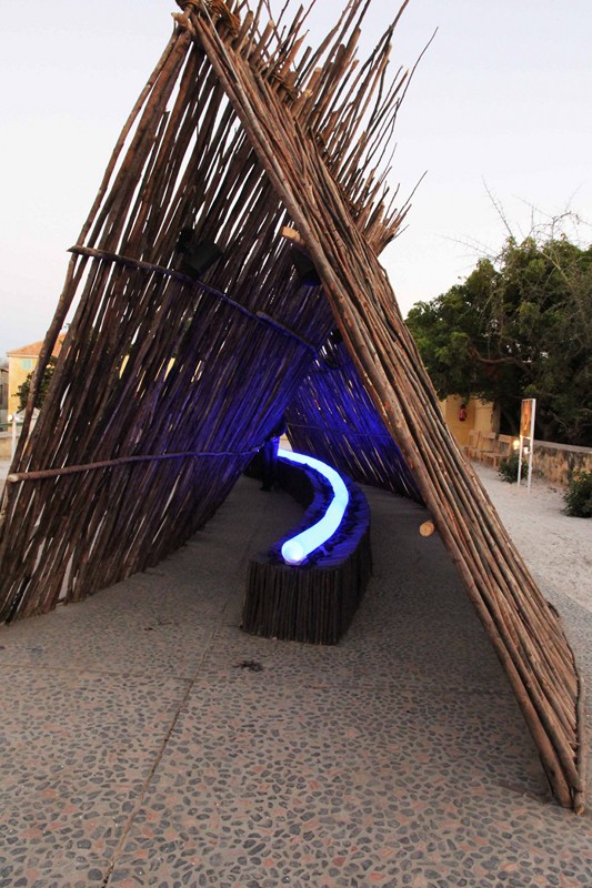 Avec son œuvre Gorée Atlantique, il nous raconte ce travail sur la « cicatrice » et la « plaie » laissée dans l’inconscient collectif de ceux qui ont été enchaînés. Utilisant le bois d’eucalyptus trouvé au Sine Saloum et ramené à Gorée, du charbon, des fibres végétales entre autres matériaux, cet artiste a voulu poser la réflexion sur l’identité. l’Esplanade de Gorée, est donc devenue un espace temporaire de la mémoire pour provoquer une autre lecture de l’histoire de l’esclavage. En approchant son œuvre, nous sommes tout de suite happés par l’effet de couleur néon bleu mais aussi et surtout, au delà de la forme, le ressenti avec le souffle, les murmures, les voix, les rythmes, la musique. Comme si les âmes de ceux qui ne sont plus, nous appelaient pour mieux se revisiter. Et c’est que là même que notre existence contemporaine, est en question. Qu’avons nous appris de l’histoire douloureuse du passé ? Sommes nous pour autant réconciliés avec les autres et nous mêmes ?