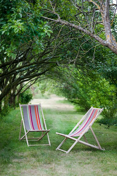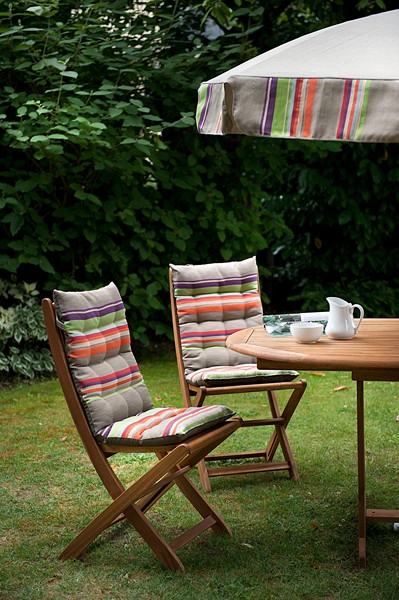 Esprit nomade pour des coussins futons qui, une fois roulés, s’attachent avec un lien pour mieux les transporter d’un coin à l’autre du jardin ! Et pour les inconditionnels de la sieste, une chaise longue avec une jolie toile à l’effet matière tissée. Une collection à adopter sans hésiter !