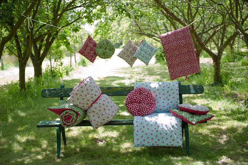 Esprit Hippie Chic … Rouge cerise, bleu ciel, beige rosé ou vert anglais … des couleurs à mélanger et un semi de petites fleurs liberty pour les nouveaux romantiques à l’esprit nomade. Une collection de coussins futons qui se roulent et s’attachent avec un lien pour mieux les transporter d’un coin à l’autre du jardin !