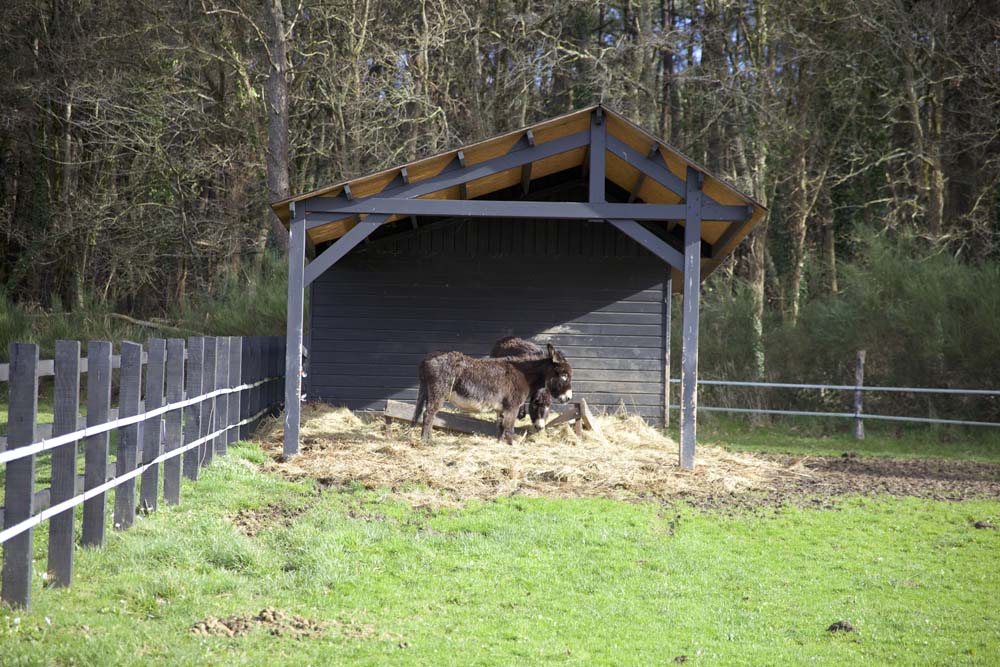 Un petit hangar abritant deux jolies petites mules et au loin une vache bretonne pour parfaire un paysage idyllique.