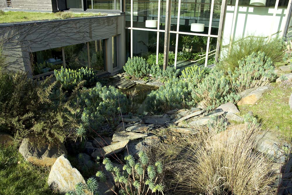 Douches et robinets sont munis de limitateurs de débits pour modérer vos consommations. Traitement UV permettant l’utilisation minimum du chlore dans les bassins. Eau entièrement recyclée, récupérée dans un bassin, elle alimente l’arrosage des toits  végétalisés des chambres et l’arrosage et nettoyage des terrasses.